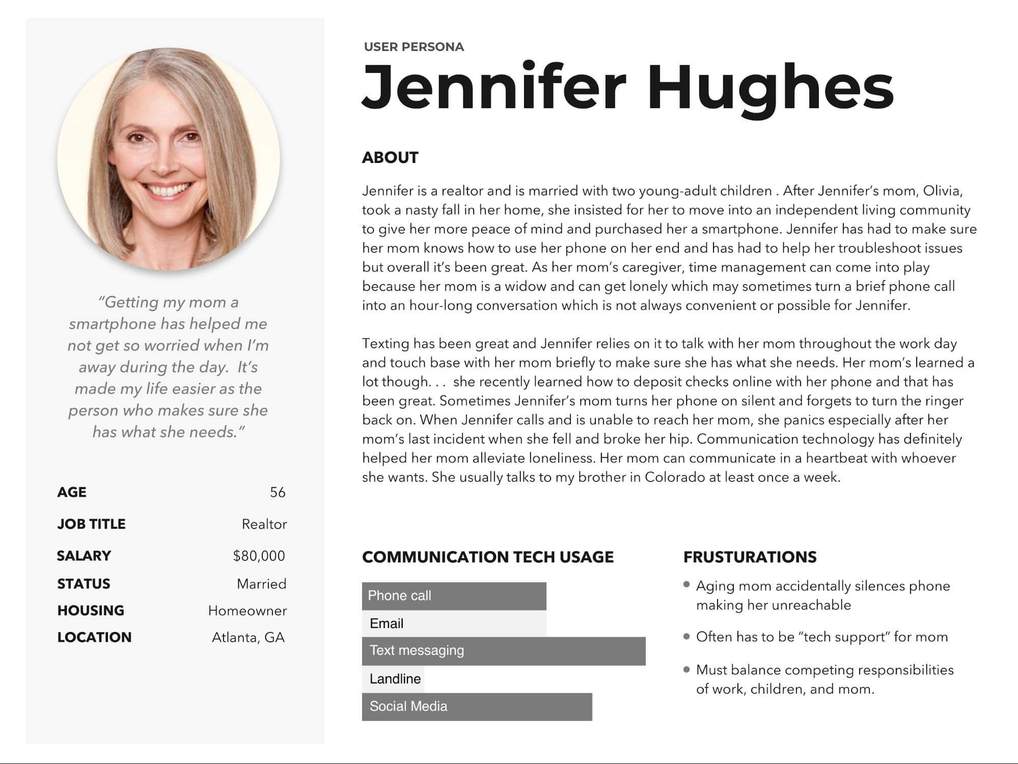 - Developed unique research methodology involving surveying and interviewing to explore the relationship and needs between an interconnected pair of users: caregivers and care receivers.